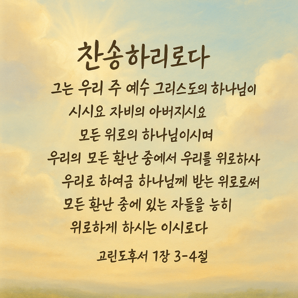 이 말씀은 우리가 위로받는 이유와 목적을 분명히 보여줍니다. 하나님의 위로는 멈춰 있는 것이 아니라, 계속해서 전달되고 흘러가는 은혜입니다. 내가 겪은 아픔이 헛되지 않도록, 내가 받은 위로가 이웃을 살리는 통로가 되도록, 오늘도 하나님의 자비를 묵상하며 그 사랑을 나누는 삶을 살아가야 하겠습니다.