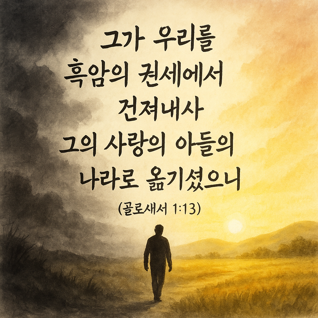이 말씀이 오늘 우리에게 주는 도전은 분명합니다. 우리가 어디에 속해 있는지를 늘 기억하고, 그에 합당한 삶을 살아가야 한다는 것입니다. 어둠의 삶이 익숙해서 때때로 뒤돌아보고 싶은 유혹이 찾아오더라도, 우리는 이미 사랑의 아들의 나라로 옮겨진 존재임을 잊지 말아야 합니다.