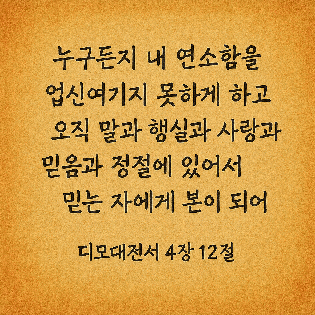 이 말씀은 오늘날을 살아가는 우리에게도 동일하게 적용됩니다. 나이, 직위, 경험과 상관없이 하나님의 말씀대로 살아가는 자는 다른 이들에게 본이 됩니다. 우리가 있는 자리에서 말과 행동으로, 사랑과 믿음, 그리고 정결한 삶으로 하나님 나라의 증인이 되기를 소망합니다.