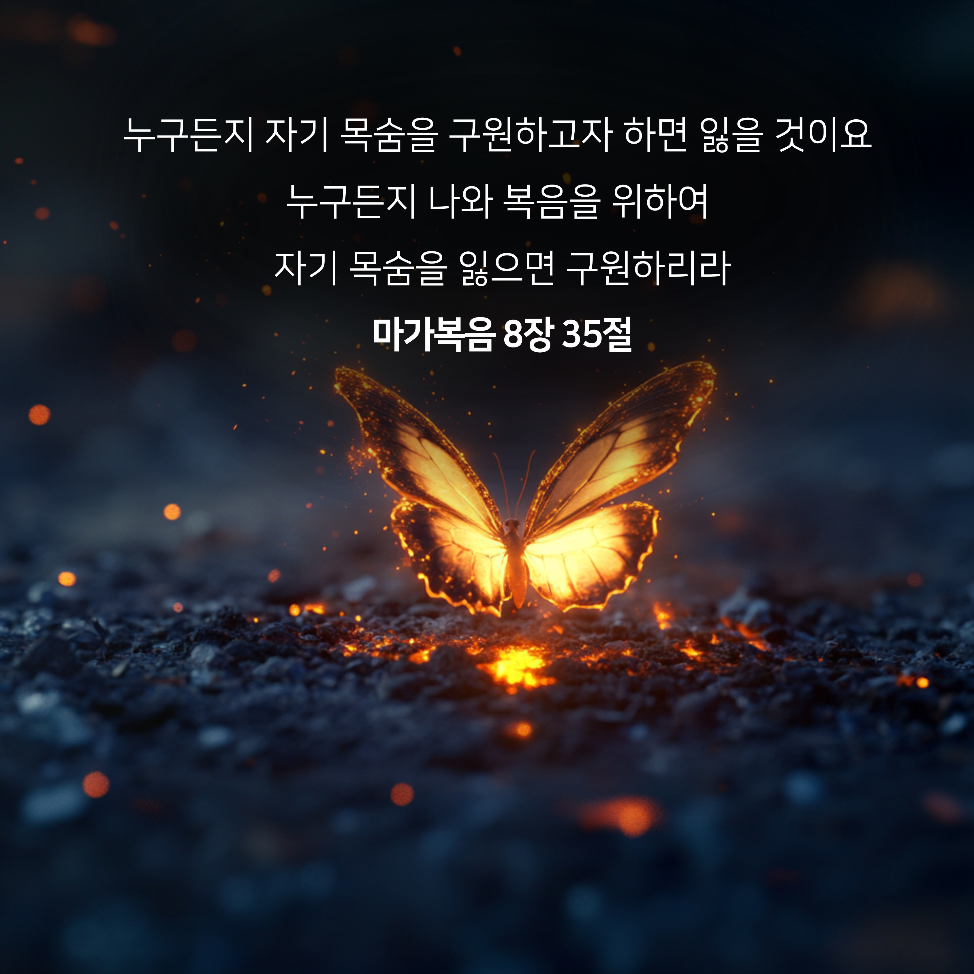 오늘의 말씀은 마가복음 8장 35절 말씀입니다. 개역개정 성경에는 이렇게 기록되어 있습니다.