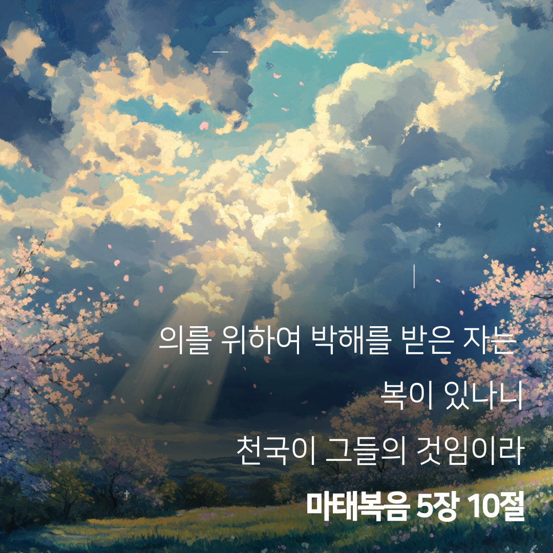 세상은 종종 의로운 삶을 불편해합니다. 진리를 외치는 자, 정의를 추구하는 자는 세상의 가치와 충돌하기에 고난을 겪게 됩니다. 하지만 하나님께서는 그러한 삶을 귀하게 여기시고, 천국을 약속하십니다. 박해는 고통스럽지만, 그 고통 속에는 하늘의 위로와 은혜가 함께합니다.