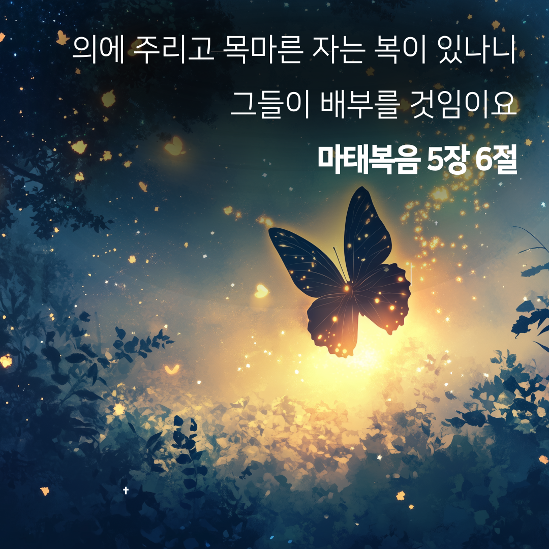 사랑의 하나님, 오늘도 주님의 말씀 앞에 제 마음을 엽니다. 주님께서 말씀하신 대로 의에 주리고 목마른 자가 되기를 원합니다. 세상의 가치와 기준이 아닌, 하나님의 뜻과 의로움에 갈급한 심령이 되게 하옵소서.