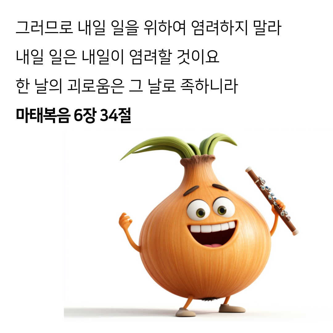 주님, 저의 연약함을 아시고 긍휼히 여겨 주옵소서. 내일을 주님께 온전히 맡기고, 오늘 하루를 믿음으로 살아가게 하옵소서. 염려로 가득한 마음이 아니라, 감사와 찬양이 넘치는 삶이 되도록 도와주옵소서.