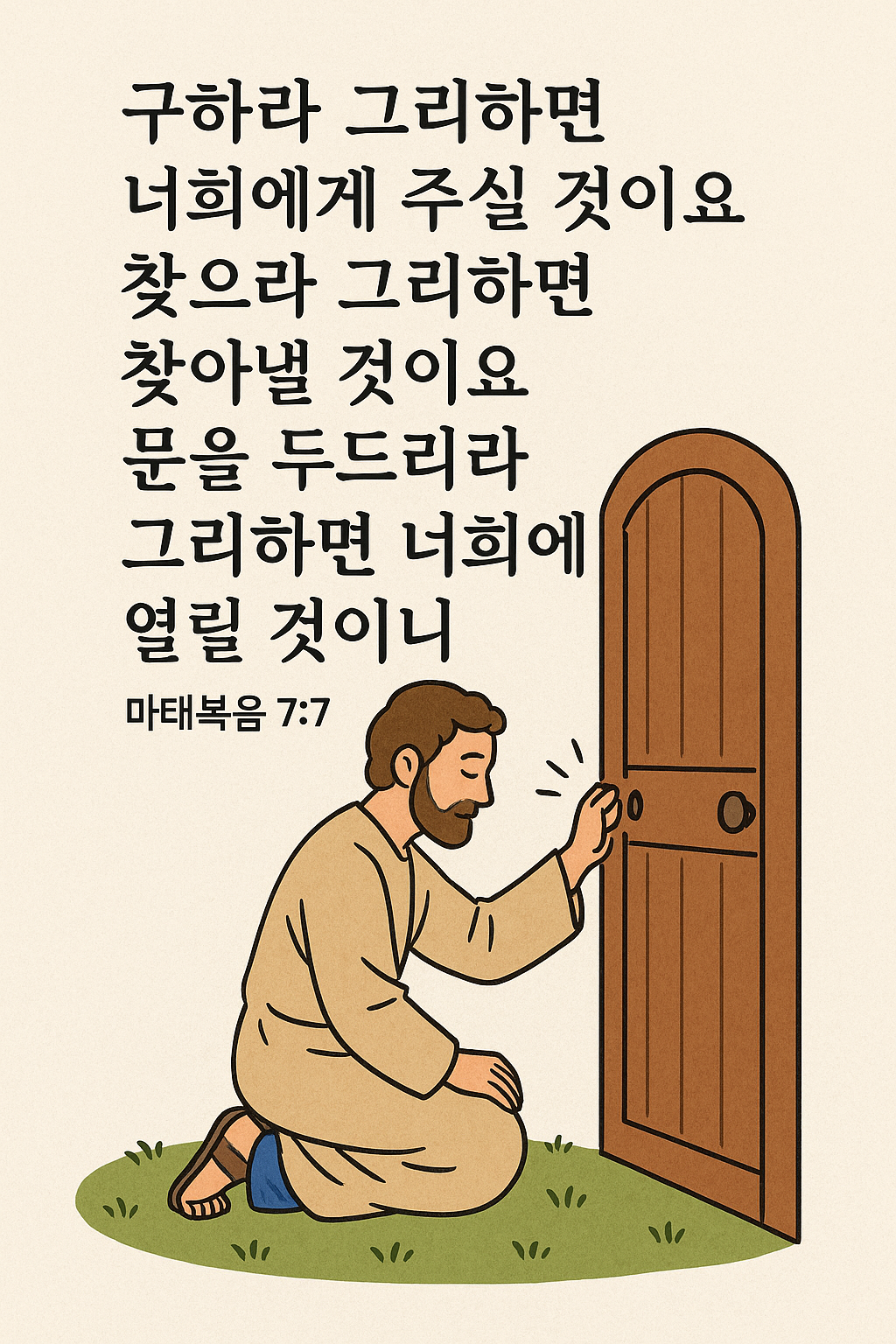 제 기도가 단지 제 소원을 이루려는 것이 되지 않게 하시고, 하나님의 뜻을 이루는 도구가 되게 하옵소서. 구하는 마음 속에 주님의 사랑을 깊이 경험하게 하시고, 찾는 길 위에서 주님의 지혜를 배우며, 두드리는 기다림 속에서 주님의 신실하심을 더욱 알게 하옵소서.