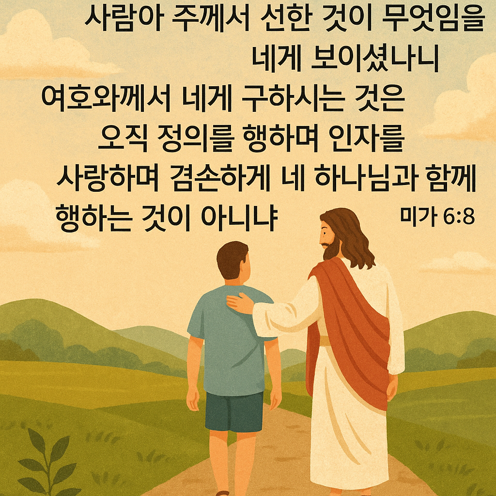 겸손히 행한다는 것은 하나님을 의지하고, 내 힘이 아니라 주님의 뜻을 따라 살겠다는 태도입니다. 세상의 기준이 아닌 하나님의 말씀에 귀 기울이며, 그분의 동행을 소중히 여길 때 비로소 우리의 삶은 선한 길 위에 서게 됩니다.