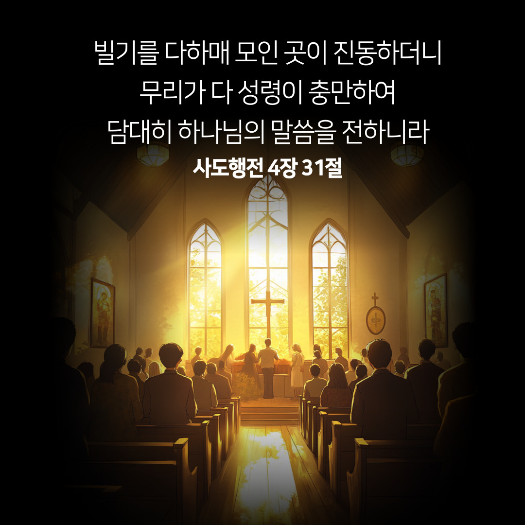 사도행전 4장 31절은 초대 교회 성도들의 기도와 그 기도에 응답하신 하나님의 능력을 증언하는 장면입니다. “빌기를 다하매”라는 표현은 그들이 하나가 되어 마음을 모아 간절히 기도했음을 보여줍니다. 그리고 그 기도는 단순한 형식적인 것이 아니라, 생명의 위협 가운데서도 하나님의 뜻을 이루기 위한 간절한 부르짖음이었습니다. 그들의 기도에 응답하시는 하나님의 방식은 놀랍습니다. 기도하는 장소가 진동하였고, 그들에게 성령이 충만히 임하셨습니다. 이는 하나님께서 그들의 기도를 들으셨고, 그들에게 다시금 능력과 담대함을 부어주셨다는 강력한 표징이었습니다. 특히 “무리가 다 성령이 충만하여 담대히 하나님의 말씀을 전하니라”는 구절은 우리에게 매우 중요한 도전을 줍니다. 우리도 삶의 자리에서 하나님의 말씀을 전할 때 두려움이 앞설 수 있습니다. 그러나 성령께서 우리 안에 충만히 거하실 때 우리는 그 어떤 환경 속에서도 담대하게 복음을 선포할 수 있게 됩니다. 이 말씀은 단순히 초대 교회에만 해당되는 사건이 아닙니다. 오늘을 살아가는 우리도 동일한 하나님, 동일한 성령님을 의지하며 그분의 도우심을 구할 때, 똑같이 담대히 하나님의 말씀을 증거할 수 있습니다. 믿음의 공동체가 함께 모여 기도할 때, 하나님께서 역사하시며 그분의 뜻을 이루어가심을 다시금 확신할 수 있는 말씀입니다.