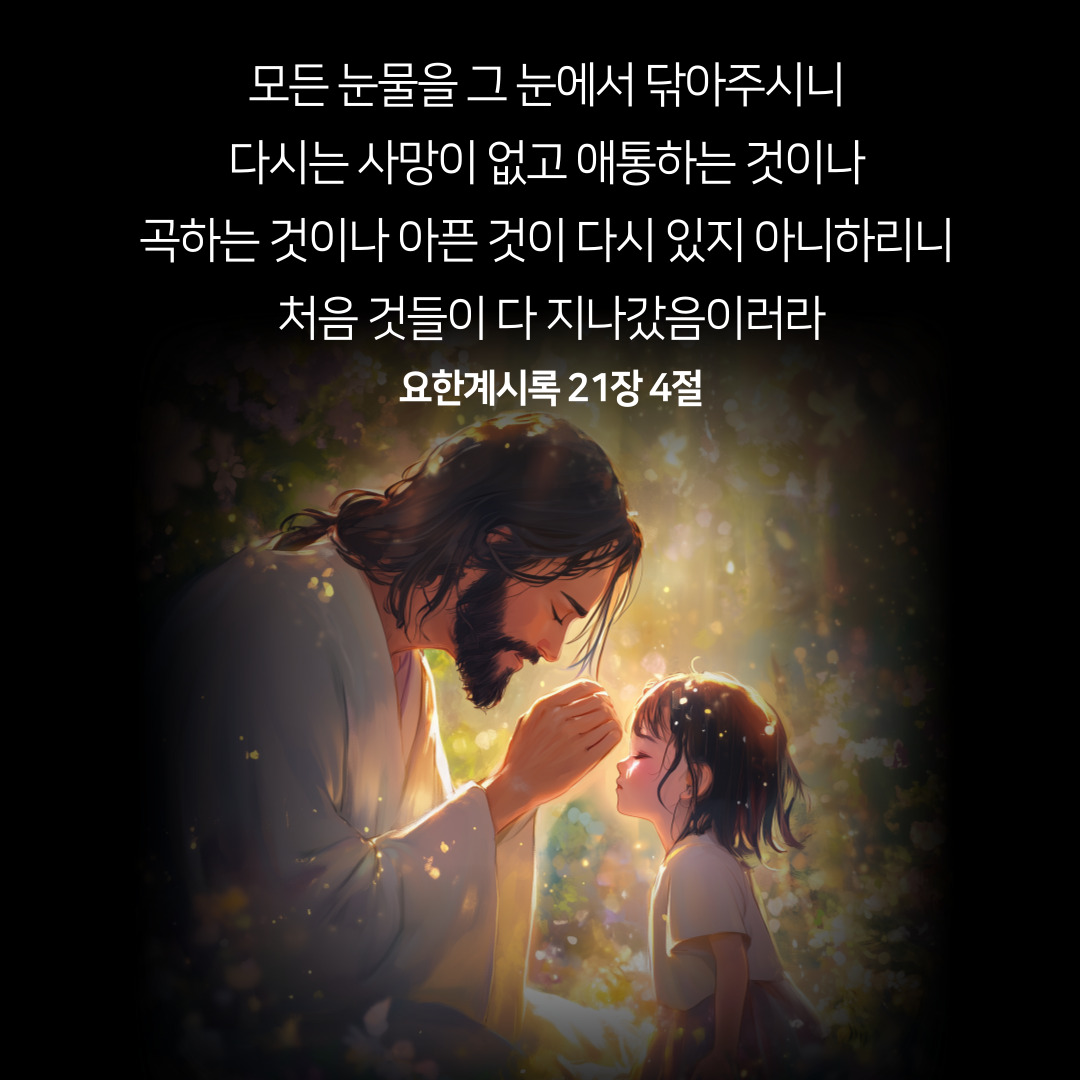 주님, 저희가 슬퍼하고 고통스러울 때에도 주님의 약속을 잊지 않게 하옵소서. 사망도, 애통도, 아픔도 없는 그 영광스러운 날을 바라보며 믿음의 경주를 끝까지 달려가게 하옵소서. 주님께서 친히 저희를 안아주시고 위로하시며 인도하시는 그 사랑을 날마다 경험하게 하옵소서.